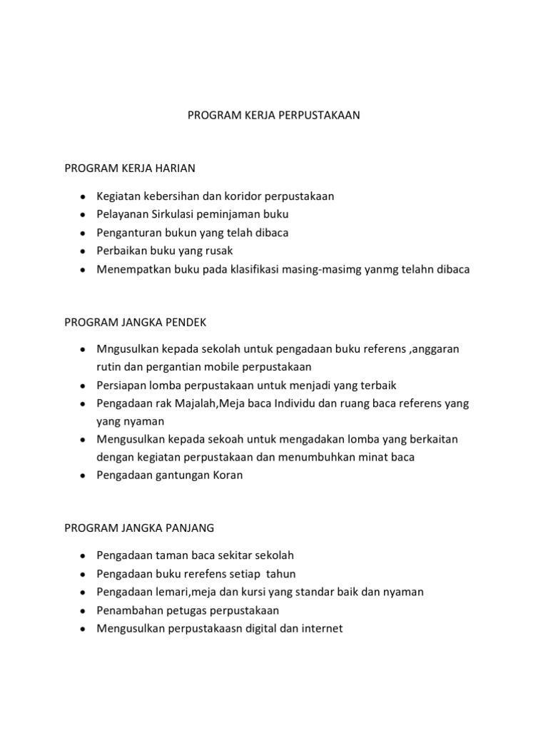 Perpustakaan sekolah adalah perpustakaan yang tergabung pada sebuah sekolah, dikelola sepenuhnya oleh sekolah yang bersangkutan dengan tujuan usaha membantu sekolah untuk mencapai tujuan khusus sekolah dan tujuan pendidikan pada. Perputakaan perpustakaan sampai saat ini belum ada. Berikut ini adalah contoh penyusunan program kerja sekolah dan contoh rincian tugas. Arsip contoh format penyusunan program kerja perpustakaan untuk smk atau juga sma. Contoh program kerja kepala sekolah.